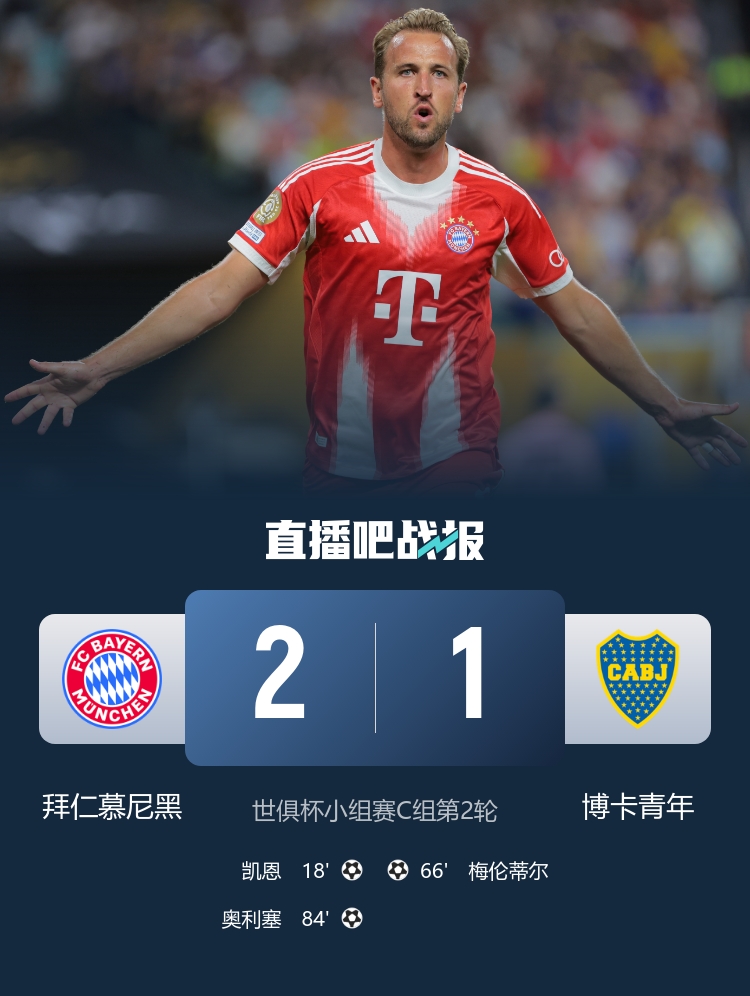 6月21日訊 北京時(shí)間9:00,世俱杯小組賽C組第2輪拜仁慕尼黑vs博卡青年,比賽在硬石體育場打響!上半場,奧利塞角球直接破門被吹;凱恩破門打破僵局!下半場,梅倫蒂爾超車+人球分過一條龍破門!奧利塞勁射破門幫助拜仁再次領(lǐng)先!萊默爾進(jìn)球被吹越位。最終,拜仁2-1戰(zhàn)勝博卡青年,兩連勝提前出線!博卡落敗,南美球隊(duì)吃到本屆世俱杯首場敗仗。