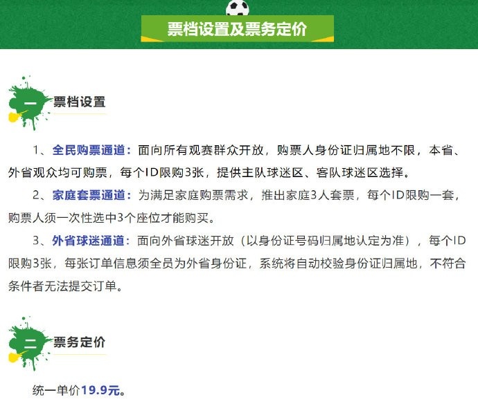 1、全民購票通道:面向所有觀賽群眾開放,購票人身份證歸屬地不限,本省、外省觀眾均可購票,每個ID限購3張,提供主隊球迷區(qū)、客隊球迷區(qū)選擇。
