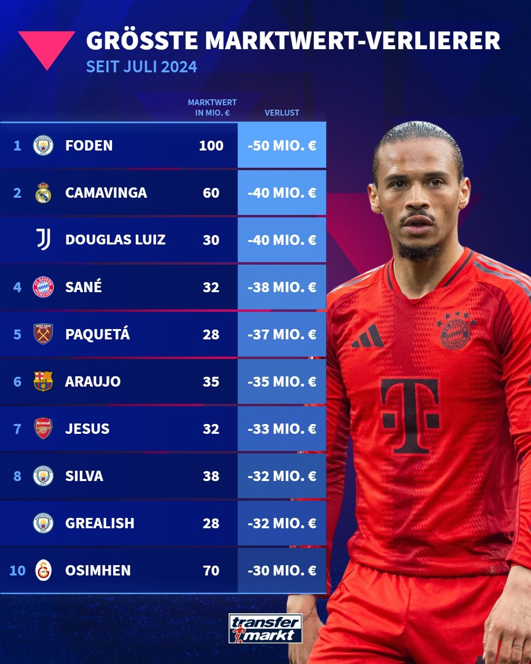 4-薩內(nèi),拜仁,現(xiàn)身價3200萬,下跌3800萬