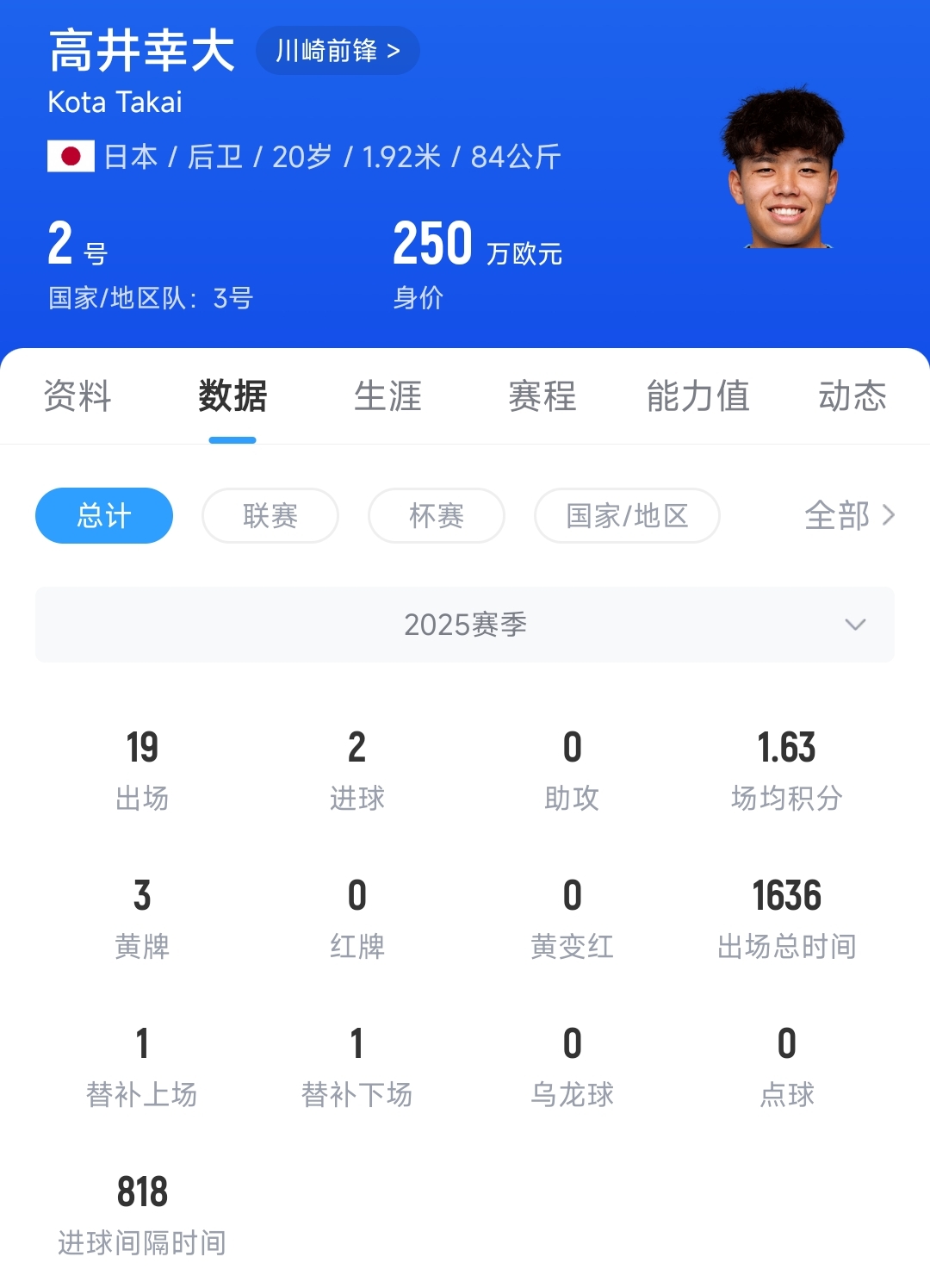 今年亞冠精英聯(lián)賽半決賽,利雅得勝利主場2-3不敵川崎前鋒無緣決賽,高井幸大首發(fā)中衛(wèi)踢滿全場。