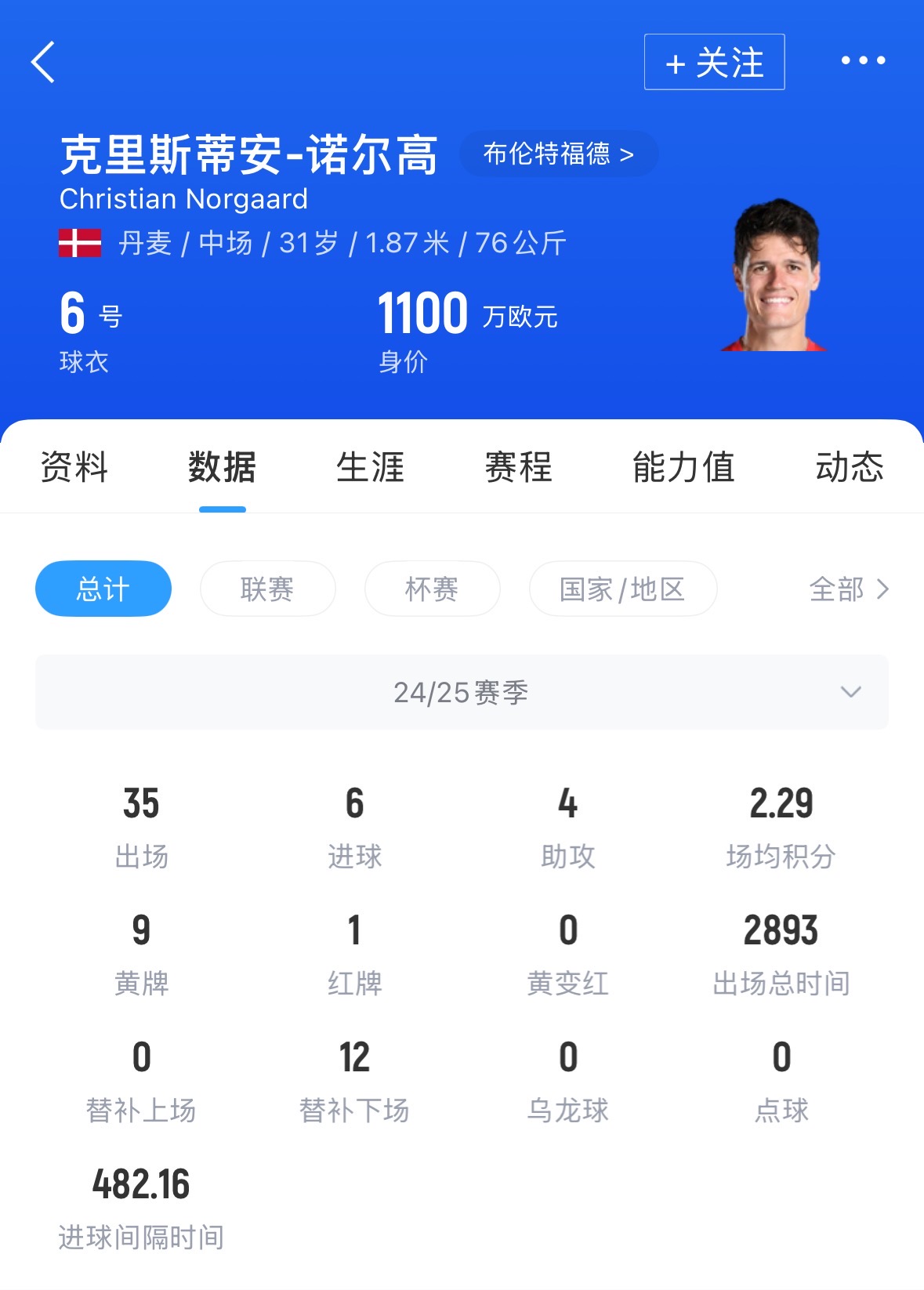 丹麥中場諾爾高,上賽季為布倫特福德各賽事出場35次,貢獻(xiàn)6球4助,目前球員德轉(zhuǎn)身價為1100萬歐。