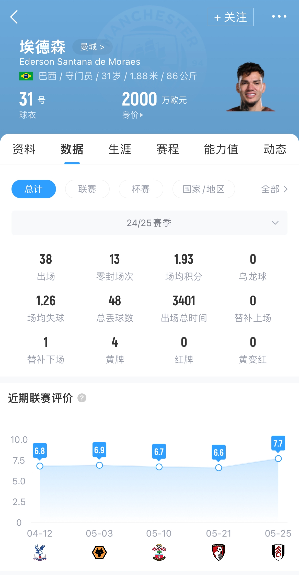 埃德森于八年前以3500萬英鎊的轉(zhuǎn)會費(fèi)加盟曼城。他與曼城的合同將在明年夏天到期。本賽季,埃德森為曼城各項賽事出場38次,其中13場零封對手,場均失球1.26球。