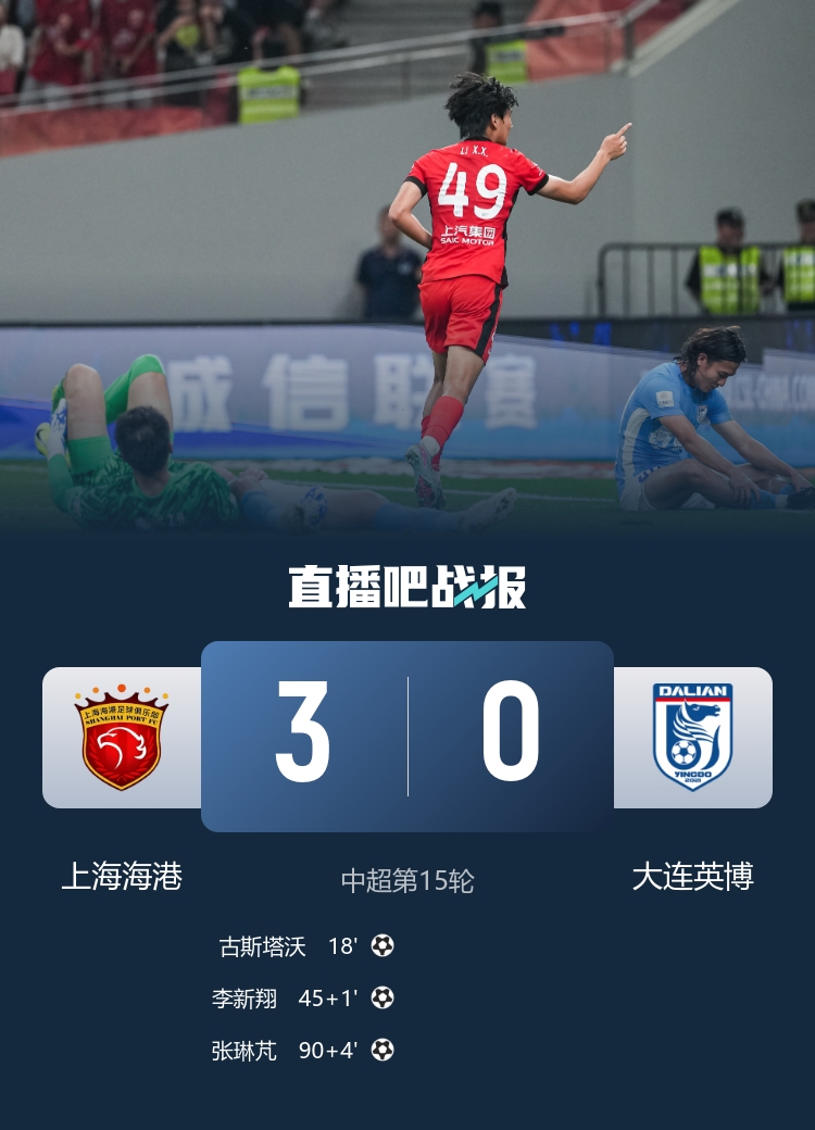 全場比賽結(jié)束,上海海港主場3-0完勝大連英博。