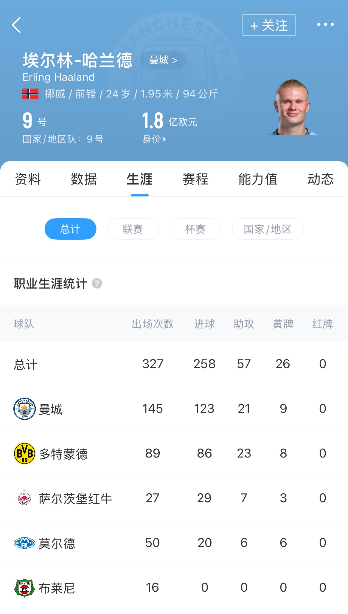 現(xiàn)年24歲的哈蘭德生涯至今共出戰(zhàn)370場(chǎng)正式比賽,攻入300粒進(jìn)球,其中俱樂(lè)部327場(chǎng)258球,國(guó)家隊(duì)43場(chǎng)42球??傆?jì)場(chǎng)均0.81球。