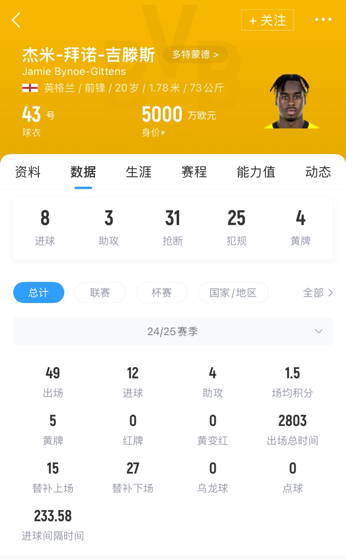本賽季至今吉滕斯各賽事代表多特出戰(zhàn)49場比賽,打進(jìn)12球助攻4次。目前球員德轉(zhuǎn)身價為5000萬歐。