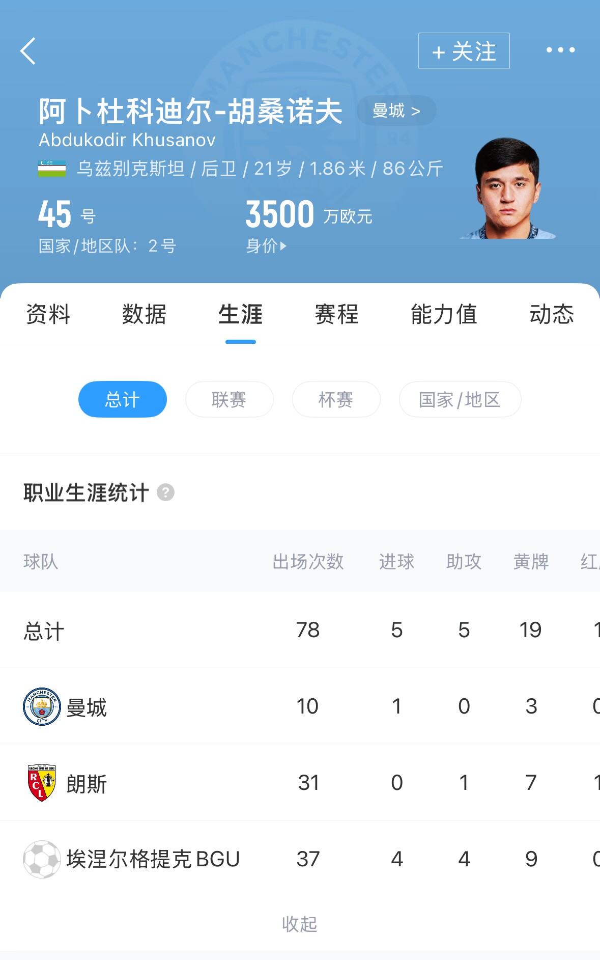 胡桑諾夫1月20日加盟曼城,轉(zhuǎn)會費(fèi)總價(jià)5000萬歐。加盟后將近半年時(shí)間共出場10次,1個(gè)進(jìn)球3張黃牌,出場時(shí)間一共745分鐘。