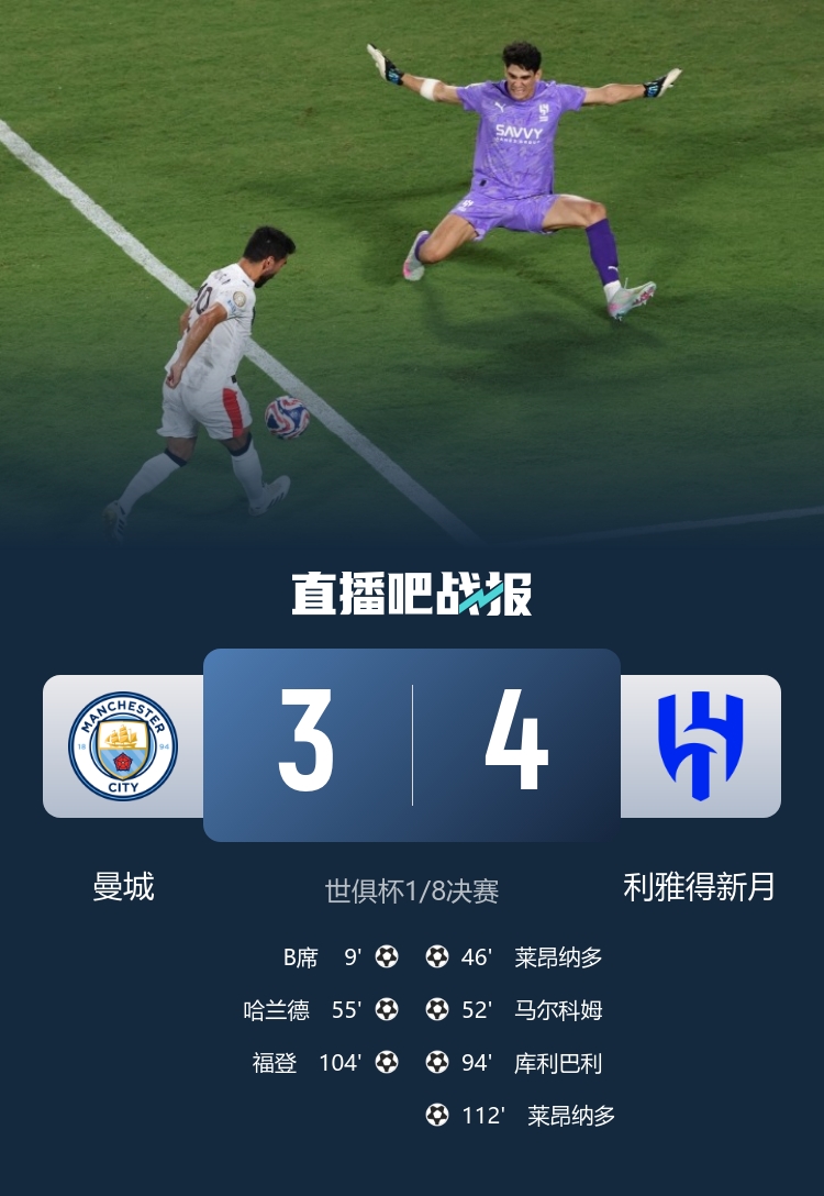 7月1日訊 世俱杯1/8決賽,曼城加時(shí)賽3-4不敵利雅得新月,無緣下一輪。