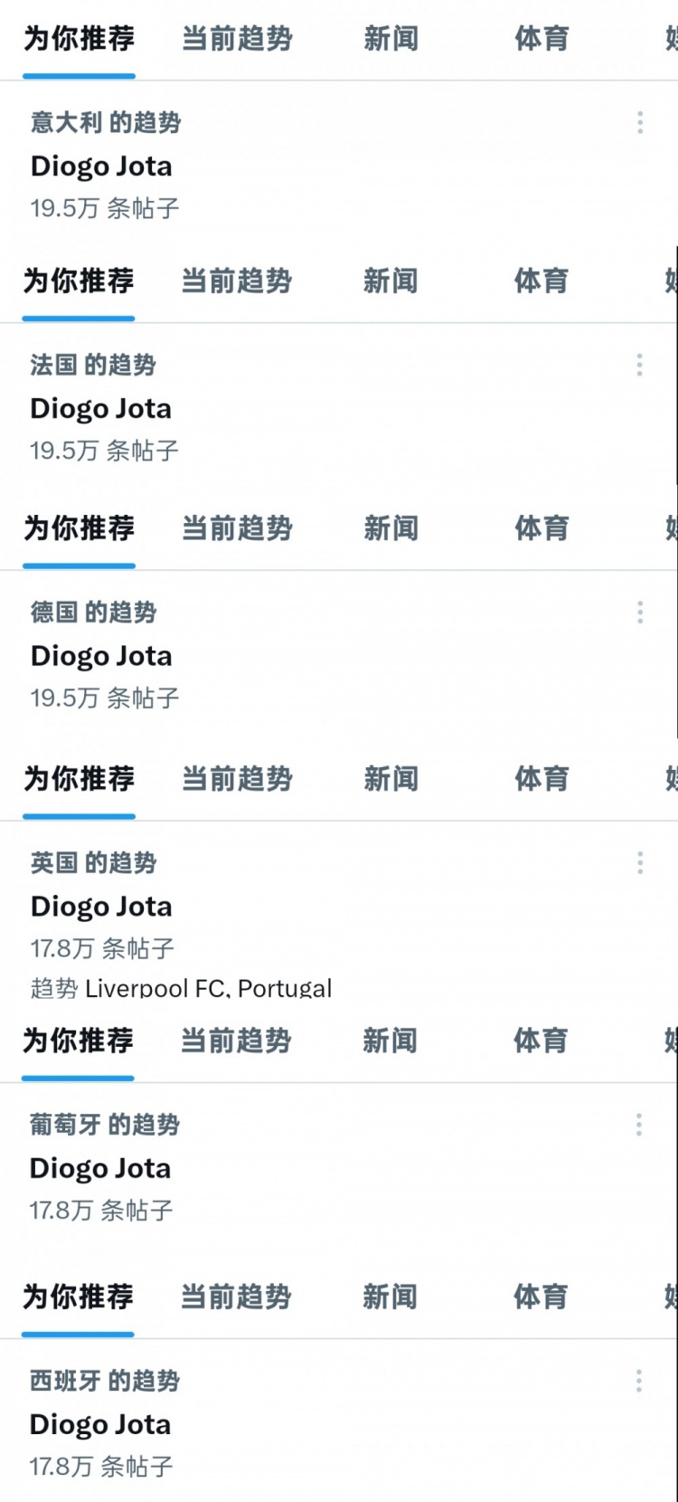 在葡萄牙、英國(guó)、西班牙、法國(guó)、德國(guó)、意大利等多國(guó)的X平臺(tái)上,迪奧戈-若塔的詞條都排在第一位。