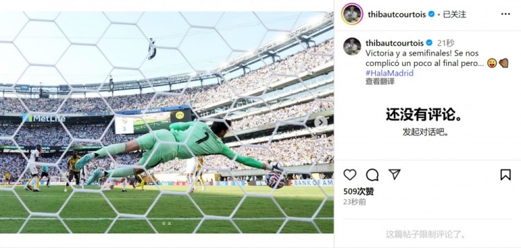 庫爾圖瓦社媒曬出撲救的照片,配文:“取勝并晉級半決賽!最后時刻有點棘手,但…????Hala Madrid”