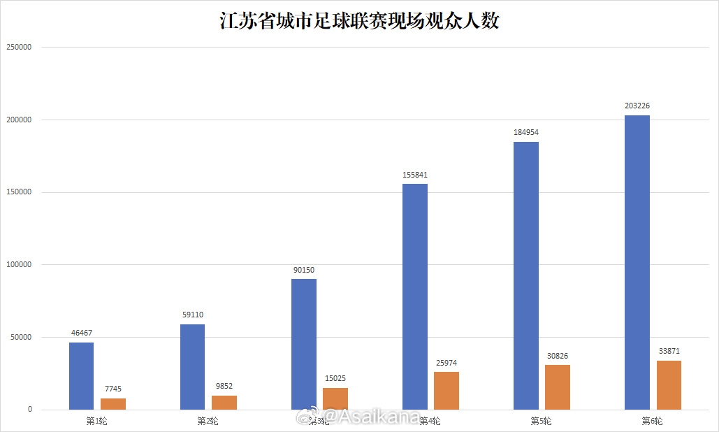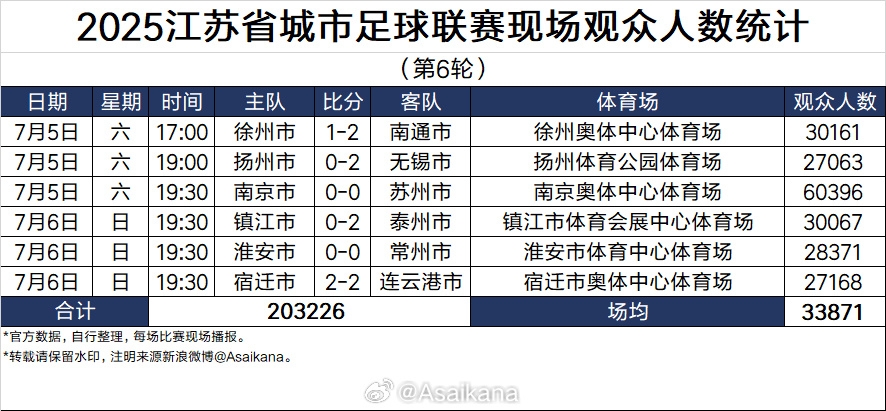 07月06日訊 江蘇省城市足球聯(lián)賽第六輪戰(zhàn)罷,德轉(zhuǎn)朱藝統(tǒng)計(jì)了本輪“蘇超”場(chǎng)均觀賽人數(shù)以及總?cè)藬?shù)。值得一提的是,第六輪總計(jì)超20萬(wàn)人現(xiàn)場(chǎng)觀賽,場(chǎng)均人數(shù)為33871,再次刷新了紀(jì)錄。