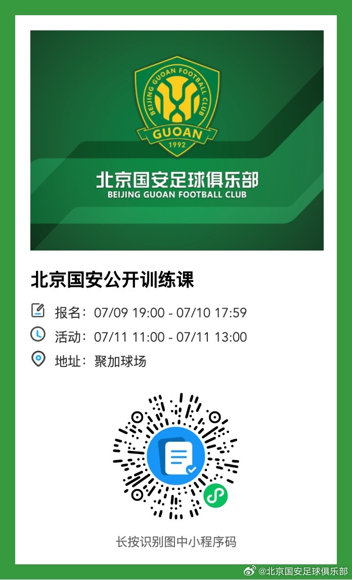 北京國(guó)安足球俱樂(lè)部將在7月11日(本周五)舉行公開訓(xùn)練課,現(xiàn)誠(chéng)邀球迷朋友們報(bào)名參與!報(bào)名將于今天19:00開啟!