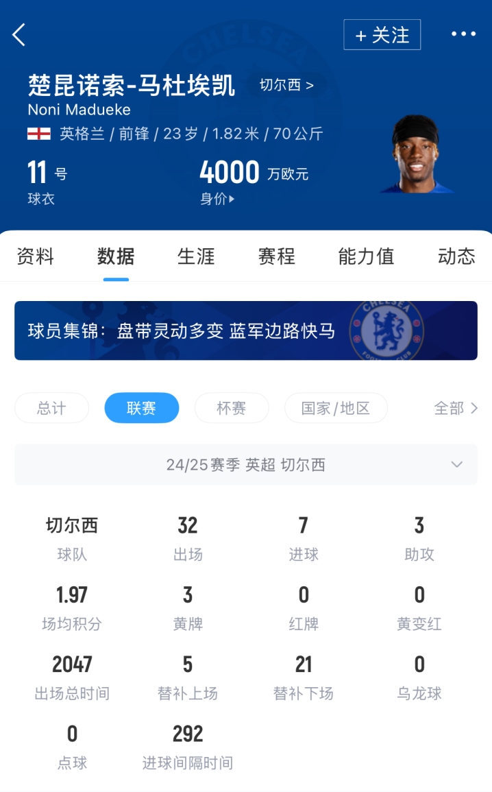 馬杜埃凱現(xiàn)年23歲,與切爾西現(xiàn)有合同在2030年到期,另有一年續(xù)約選項,球員德轉(zhuǎn)估值4000萬歐。