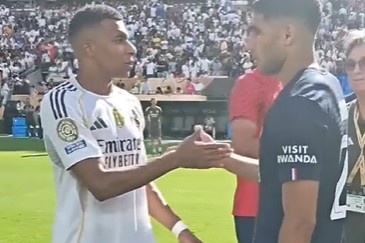 賽后,姆巴佩和巴黎前隊(duì)友阿什拉夫、貢薩洛-拉莫斯等人擁抱致意。