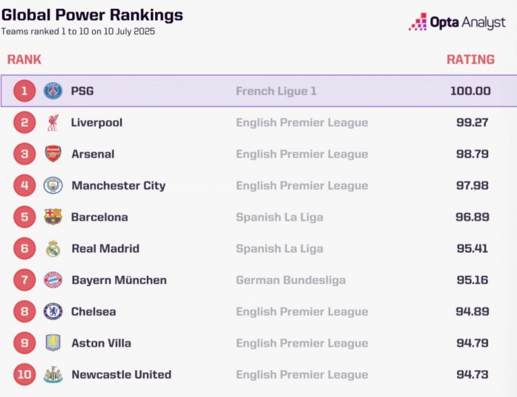 7月11日訊 巴黎在世俱杯半決賽4-0橫掃皇馬,數(shù)據(jù)機(jī)構(gòu)opta也更新了當(dāng)前俱樂(lè)部實(shí)力榜,巴黎力壓利物浦居首,前十英超占據(jù)6席。包括歐冠亞軍國(guó)米在內(nèi),沒(méi)有任何意甲球隊(duì)進(jìn)入前十。