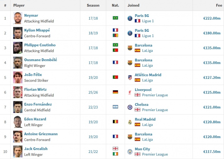 2017年,巴黎圣日耳曼以2.22億歐元的價(jià)格,從巴薩引進(jìn)內(nèi)馬爾,這筆轉(zhuǎn)會已經(jīng)過去近8年,但至今仍難以企及。轉(zhuǎn)會費(fèi)最接近內(nèi)馬爾的是姆巴佩,他在2018年夏天以1.8億歐加盟巴黎。