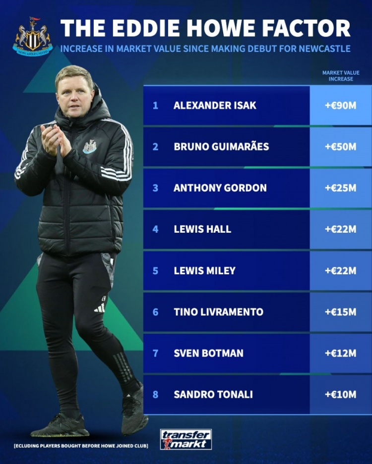 德轉列近年新援加盟紐卡后升值榜:歐元