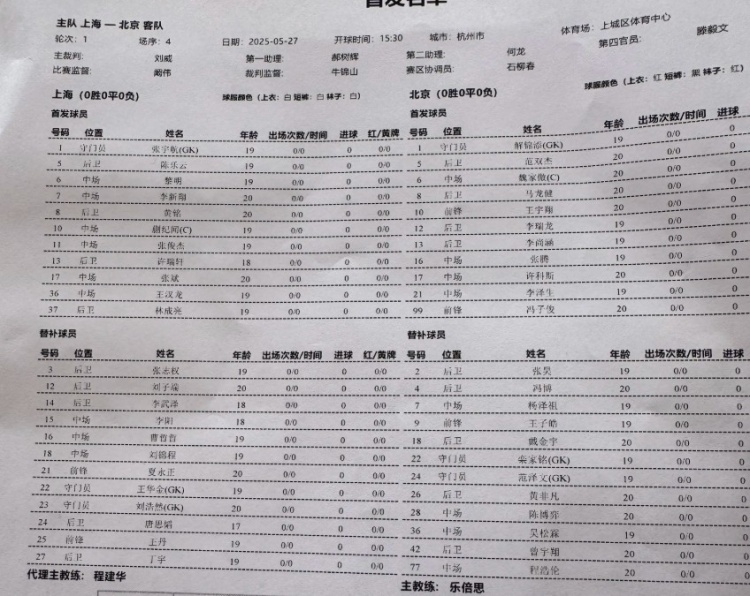全運(yùn)U20資格賽上海vs北京:蒯紀(jì)聞、李新翔、王漢龍、范雙杰先發(fā)
