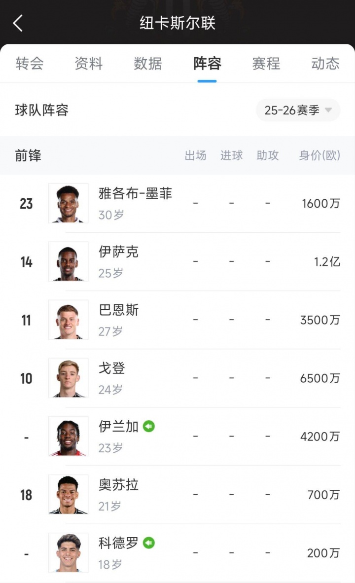 25歲伊薩克和23歲伊蘭加同是瑞典國腳,兩人身價分別是1.2億歐和4200萬歐。英格蘭國腳戈登則是6500萬歐,現(xiàn)年24歲。上賽季三人的數(shù)據(jù)分別是:伊薩克42場27球6助,伊蘭加43場6球12助,戈登42場9球7助。