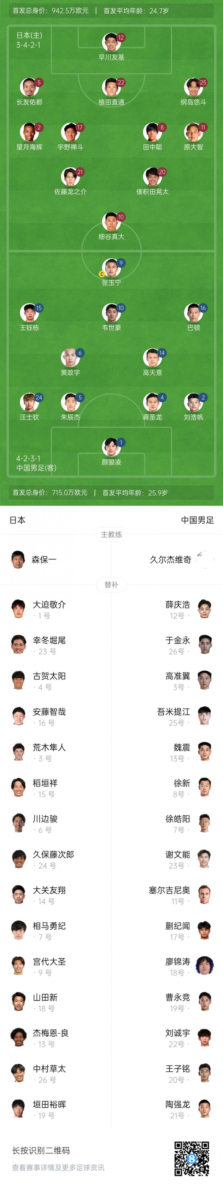 07月12日訊 東亞杯第2輪,國足vs日本首發(fā)出爐。此役國足首發(fā)平均年齡25.9歲,身價715萬歐,日本首發(fā)平均年齡24.7歲,身價942.5萬歐。