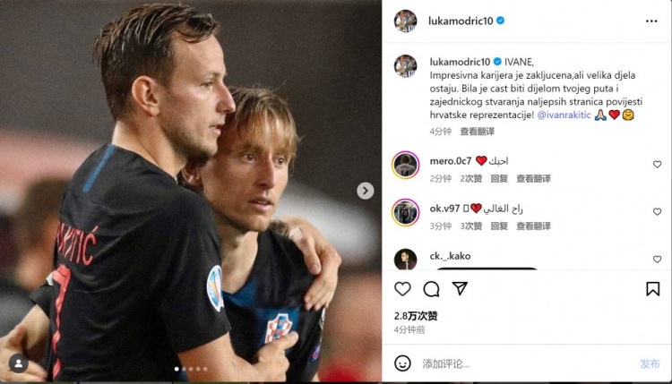 莫德里奇社媒曬出與拉基蒂奇在克羅地亞國(guó)家隊(duì)的合照,配文:“令人印象深刻的職業(yè)生涯已經(jīng)結(jié)束,但偉大的成就永遠(yuǎn)存在。能夠成為你職業(yè)生涯旅程的一部分,并共同書(shū)寫(xiě)克羅地亞國(guó)家隊(duì)歷史上最美妙的篇章,我深感榮幸!”