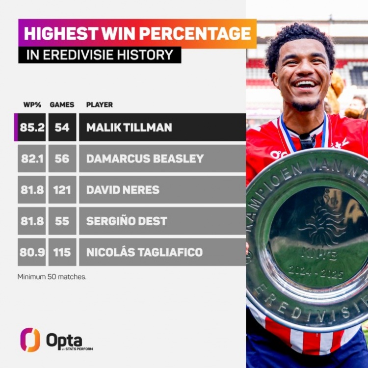 據(jù)統(tǒng)計(jì),蒂爾曼是荷甲歷史上勝率最高的球員(出場(chǎng)至少50次),他在荷甲勝率為85.2%(46勝4平4負(fù))。
