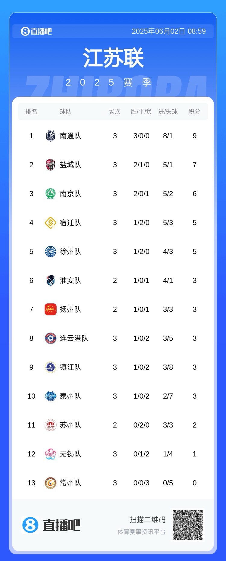 各位江蘇十三太保的球迷可以去足球→全民賽事頻道,查看對(duì)應(yīng)的積分榜!