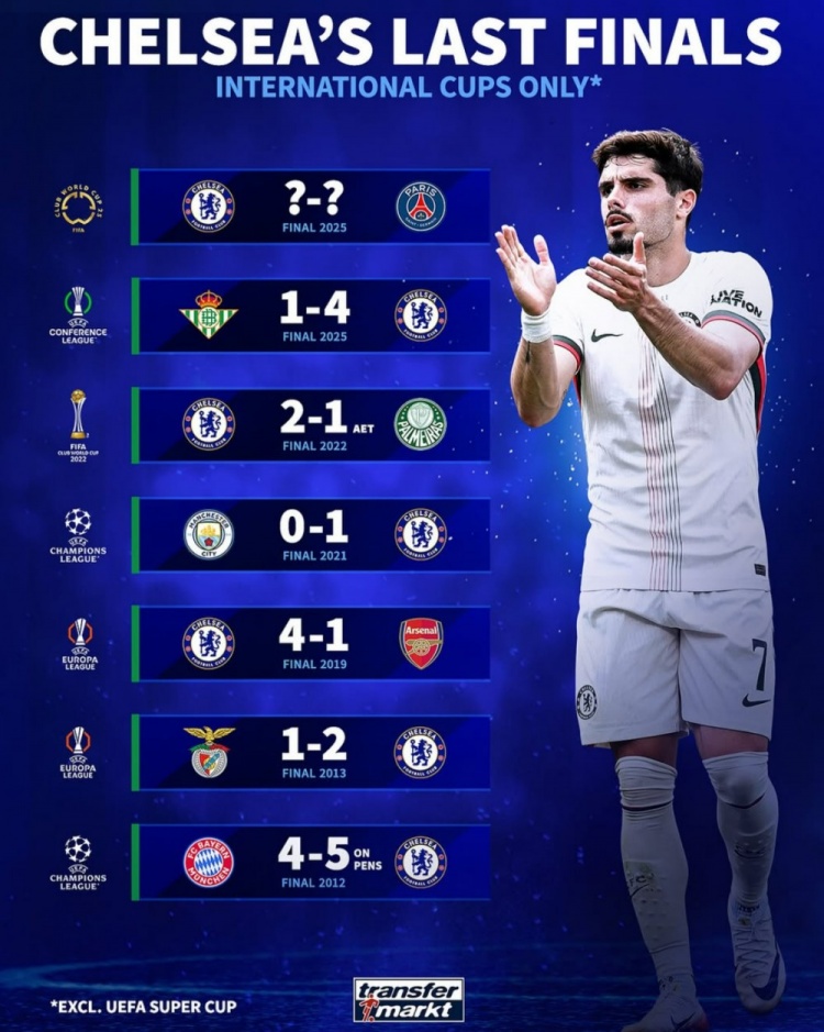 7月12日訊 世俱杯決賽將在巴黎與切爾西之間展開,德轉(zhuǎn)也盤點了切爾西近6次國際杯賽決賽的全勝表現(xiàn)(不包括歐洲超級杯):