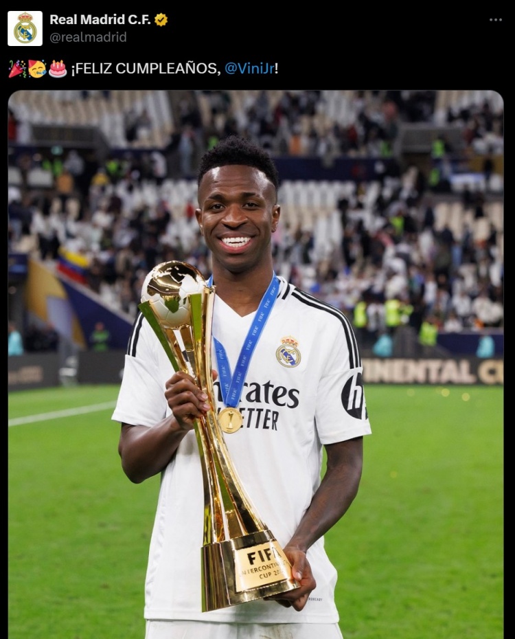 皇馬官方曬出維尼修斯本賽季贏得洲際杯的照片,并表示:“生日快樂,@維尼修斯!”