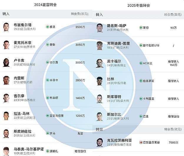 送走澤林斯基、德姆和奧斯梅恩,破費(fèi)1.5億歐元引進(jìn)盧卡庫(kù)、麥克托米奈、布翁焦?fàn)栔Z、內(nèi)雷斯、吉爾摩和拉法-馬林……2024年夏天的馬拉多納球場(chǎng)可謂是人頭攢動(dòng),德勞倫蒂斯在力所能及的范圍內(nèi)給予了孔蒂最大的支持,然而,這位鐵腕主席在處理奧斯梅恩轉(zhuǎn)會(huì)一事上的態(tài)度過(guò)于粗暴,這為后來(lái)的冬窗變故埋下了伏筆。
