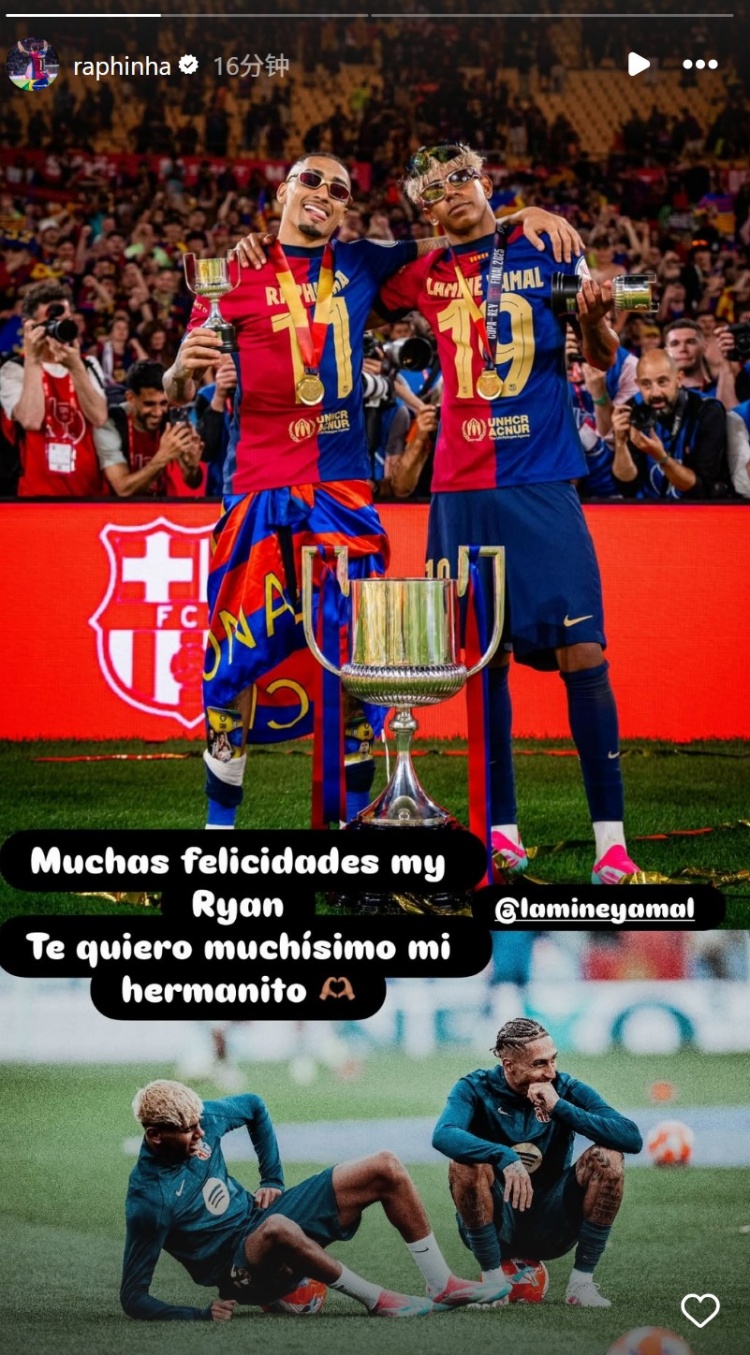 拉菲尼亞配文寫道:“祝賀亞馬爾,我真的很愛你,我的小兄弟!”