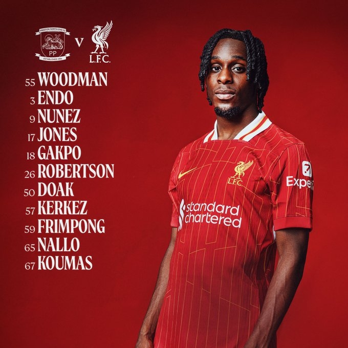 利物浦下半場陣容:56-伍德曼、3-遠(yuǎn)藤航、9-努涅斯、17-柯蒂斯-瓊斯、18-加克波、26-羅伯遜、50-本-多克、57-科爾克茲、59-弗林蓬、65-納洛、67-庫馬斯