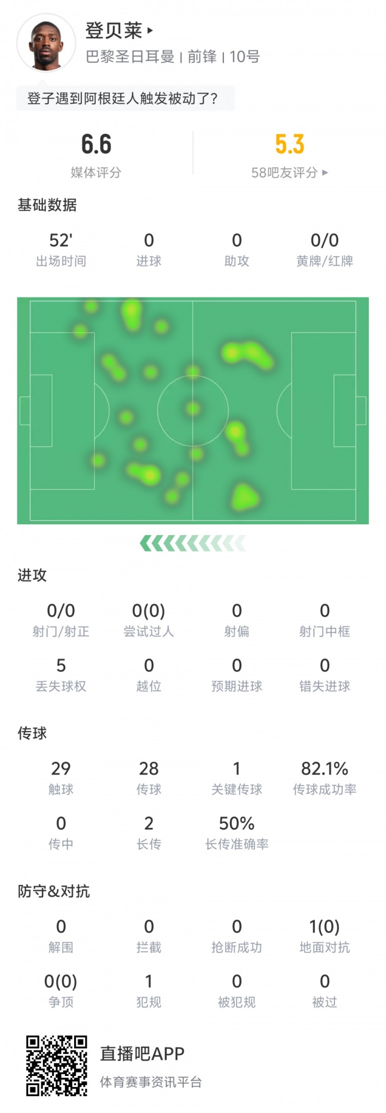 半場數(shù)據(jù)方面,登貝萊0過人0射門,5次丟失球權(quán),29次觸球,28次傳球,傳球成功率82.1%。