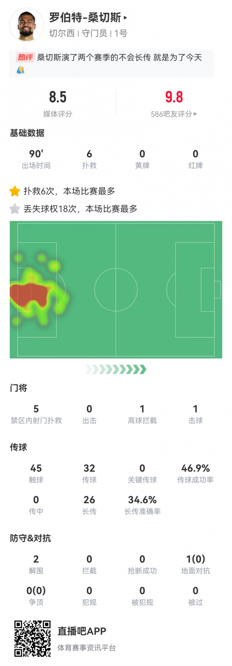 7月14日訊 切爾西在世俱杯決賽3-0完勝巴黎,羅伯特-桑切斯本場(chǎng)數(shù)據(jù)如下:
