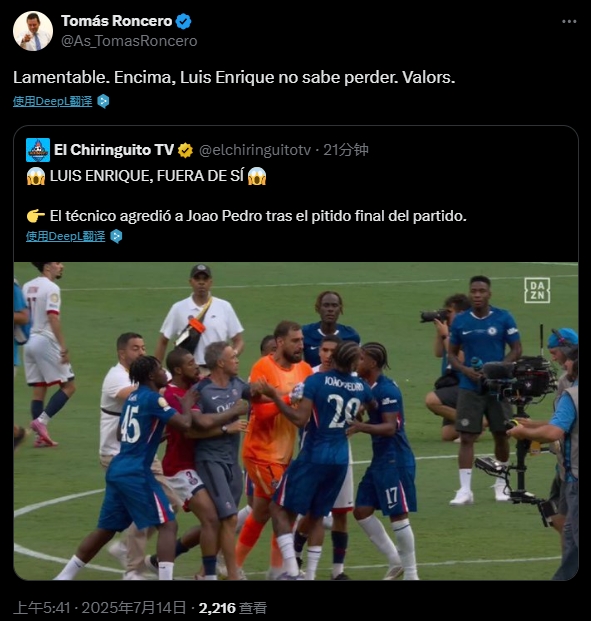 07月14日訊 2025年世俱杯決賽,切爾西3-0輕取巴黎圣日耳曼,奪得改制后首屆世俱杯冠軍。賽后恩里克與切爾西球員佩德羅發(fā)生沖突。