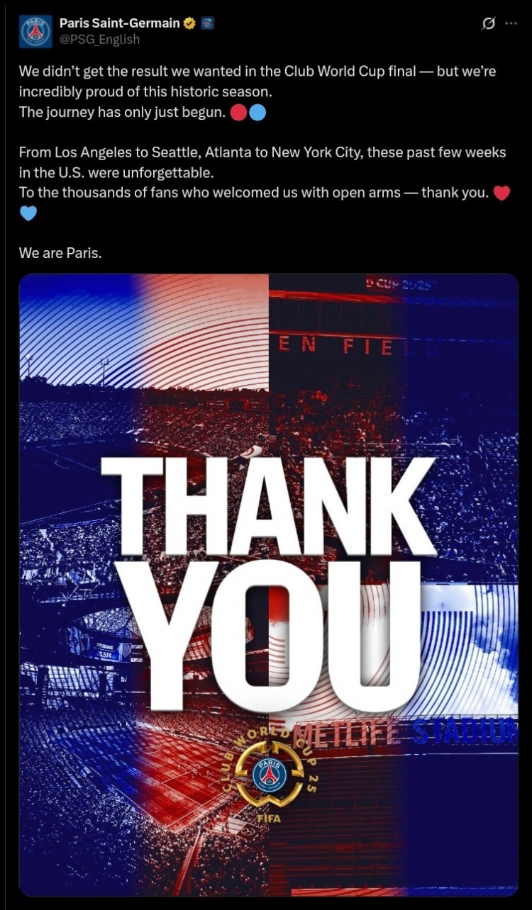 賽后巴黎官推也感謝了球迷的支持,配文寫道:“我們在世俱杯決賽沒有獲得想要的結(jié)果,但是我們?yōu)檫@個(gè)歷史性的賽季感到無比自豪。旅程才剛剛開始。從洛杉磯到西雅圖,從亞特蘭大到紐約,最近在美國的幾周令人難忘。感謝無數(shù)球迷對我們的熱情歡迎,謝謝!我們是巴黎!”