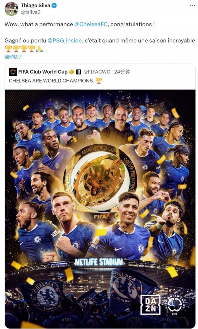 蒂亞戈-席爾瓦社媒轉(zhuǎn)發(fā)切爾西的奪冠海報,配文:“哇,切爾西的表現(xiàn)太出色了,恭喜!”