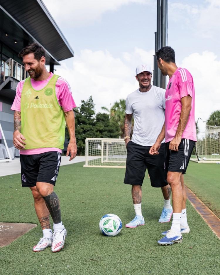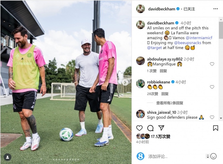 邁阿密?chē)?guó)際豪取美職聯(lián)5連勝,俱樂(lè)部股東貝克漢姆社媒曬出與梅西、布斯克茨在訓(xùn)練場(chǎng)上的合照,他笑容滿(mǎn)面,配文:“這個(gè)周末場(chǎng)上場(chǎng)下都洋溢著笑容,家人們做得太棒了,加油邁阿密?chē)?guó)際。”
