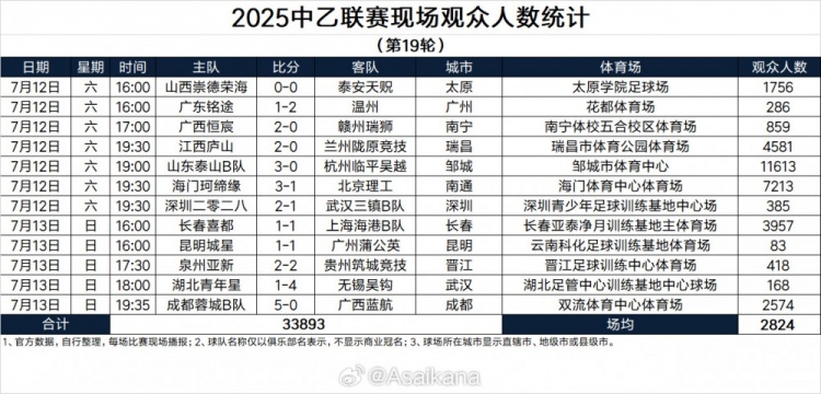 2025中乙聯(lián)賽現(xiàn)場觀眾人數(shù)統(tǒng)計(第19輪)