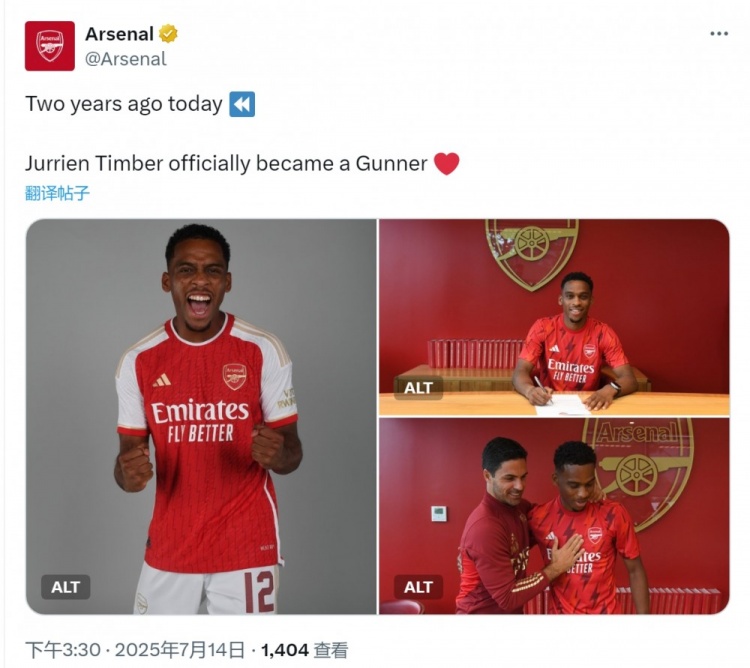 7月14日訊 阿森納官方更新社媒動態(tài),回顧廷伯兩年前加盟球隊。