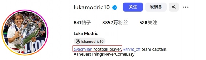莫德里奇此前的個(gè)人簡(jiǎn)介為皇馬球員,在加盟AC米蘭后,莫德里奇已經(jīng)將自己的社媒簡(jiǎn)介改為了AC米蘭球員。