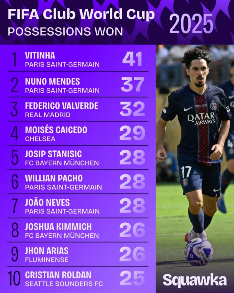 7月14日訊 2025年首屆新版世俱杯以切爾西最終問鼎而落下帷幕。據(jù)Squawka數(shù)據(jù)統(tǒng)計,世俱杯成功搶斷榜單中,巴黎維蒂尼亞以41次搶斷高居榜首。