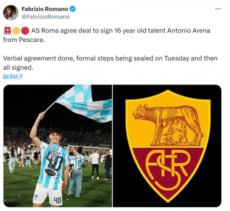 7月15日訊 據(jù)知名記者羅馬諾報(bào)道,羅馬引進(jìn)佩斯卡拉16歲前鋒阿雷納的交易達(dá)成協(xié)議。