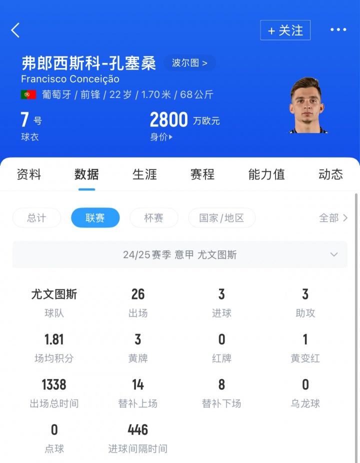 小孔塞?,F(xiàn)年22歲,24/25賽季租借加盟尤文,租借費(fèi)1000萬歐,出場40次取得7球5助攻,其中意甲26場3球3助攻。
