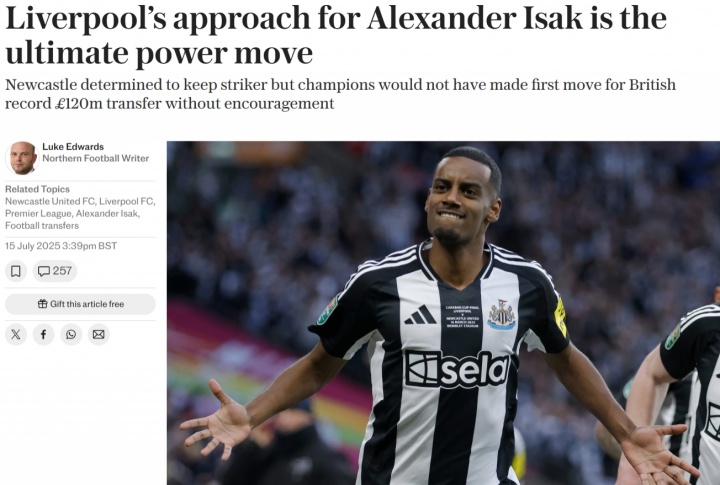 07月16日訊 利物浦向紐卡詢價(jià)伊薩克的消息昨日不脛而走,英媒《每日電訊報(bào)》揭露了利物浦在此次傳聞中的轉(zhuǎn)會(huì)策略。