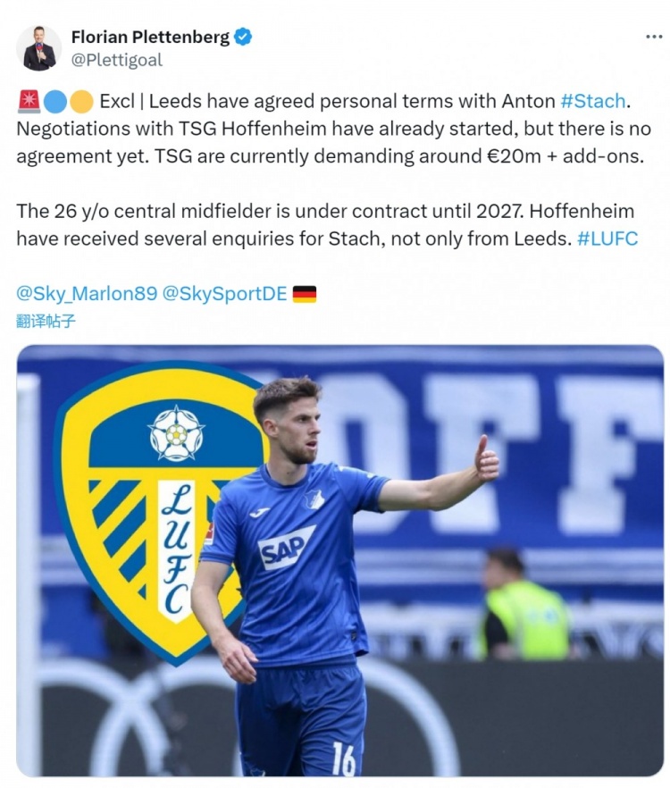 利茲聯(lián)與霍芬海姆的談判已經(jīng)開啟,但尚未達(dá)成協(xié)議,霍芬海姆目前要價(jià)約2000萬歐+獎(jiǎng)金。