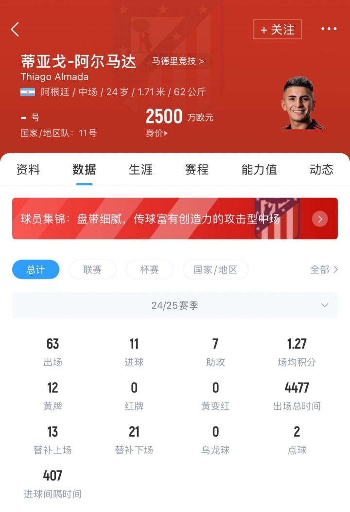 阿爾馬達(dá)現(xiàn)年24歲,阿根廷國腳中場,目前身價(jià)2500萬歐。24/25賽季冬窗,阿爾馬達(dá)從博塔弗戈租借加盟里昂,出場20次取得2球5助攻,其中法甲16場1球5助攻。