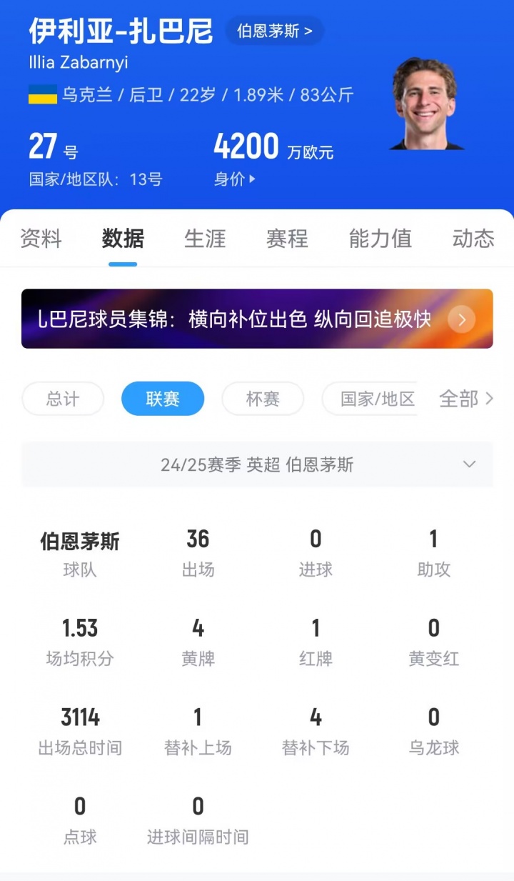 22歲的扎巴尼上賽季為伯恩茅斯出戰(zhàn)36場(chǎng)英超,與懷森組成的中衛(wèi)組合受到多支歐洲豪門關(guān)注。球員目前的德轉(zhuǎn)身價(jià)為4200萬歐元。