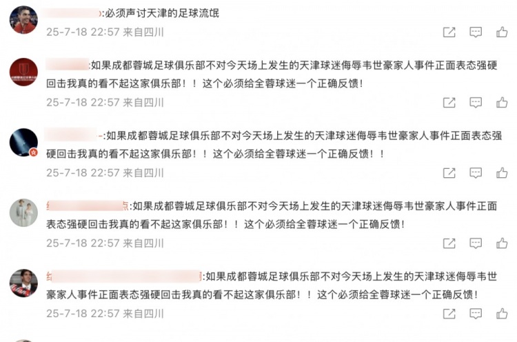 “如果成都蓉城足球俱樂(lè)部不對(duì)今天場(chǎng)上發(fā)生的天津球迷侮辱韋世豪家人事件正面表態(tài)強(qiáng)硬回?fù)粑艺娴目床黄疬@家俱樂(lè)部?。∵@個(gè)必須給全蓉球迷一個(gè)正確反饋!”蓉城球迷這樣的留言,幾乎刷屏了俱樂(lè)部官博的評(píng)論區(qū)。