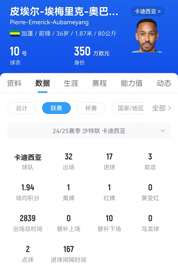 上賽季,奧巴梅楊為卡迪西亞在沙特聯(lián)賽出場32次,貢獻17球3助攻,球員目前的身價為350萬歐元。