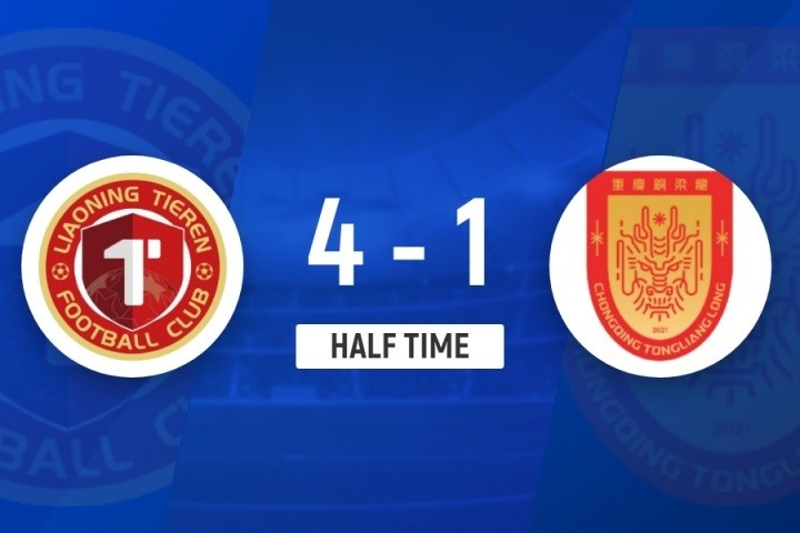 傷停補(bǔ)時(shí)6分鐘。上半場比賽結(jié)束,遼寧鐵人4-1重慶銅梁龍。